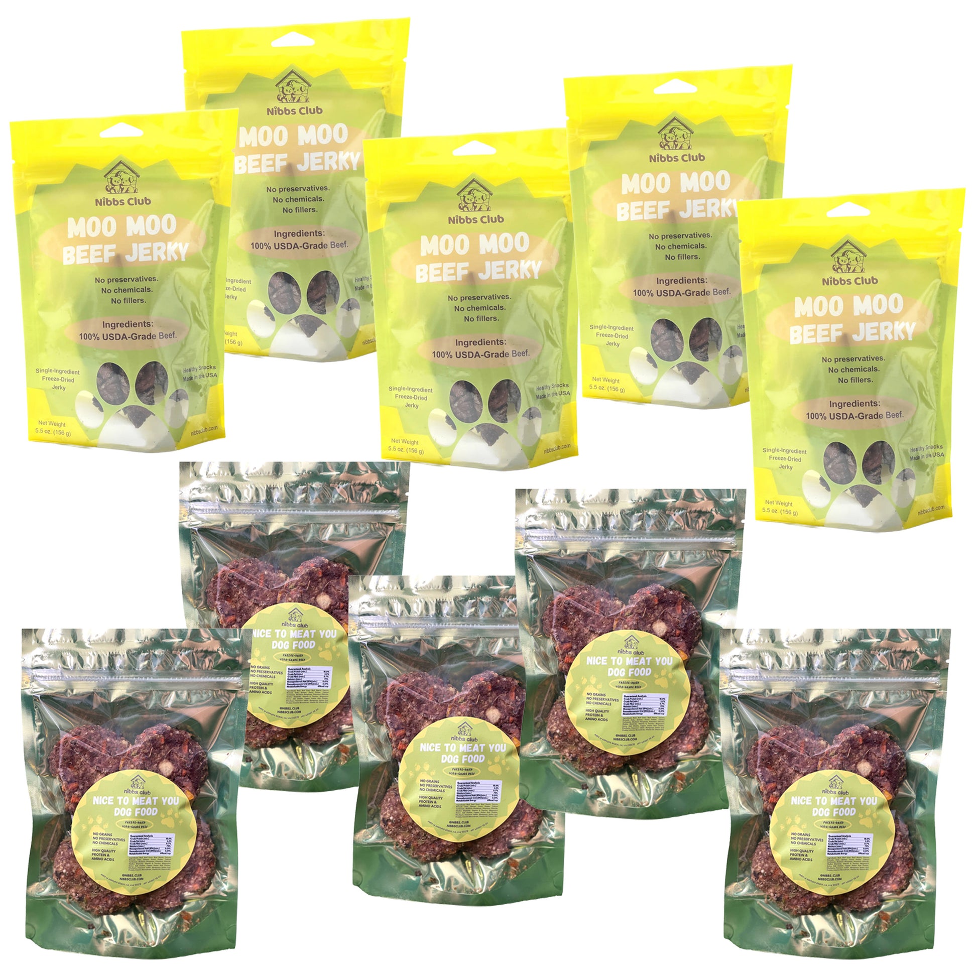 Tail Wagging Bundle – 5 Moo Moo Beef Jerky + 5 Nice To Meat You Bags